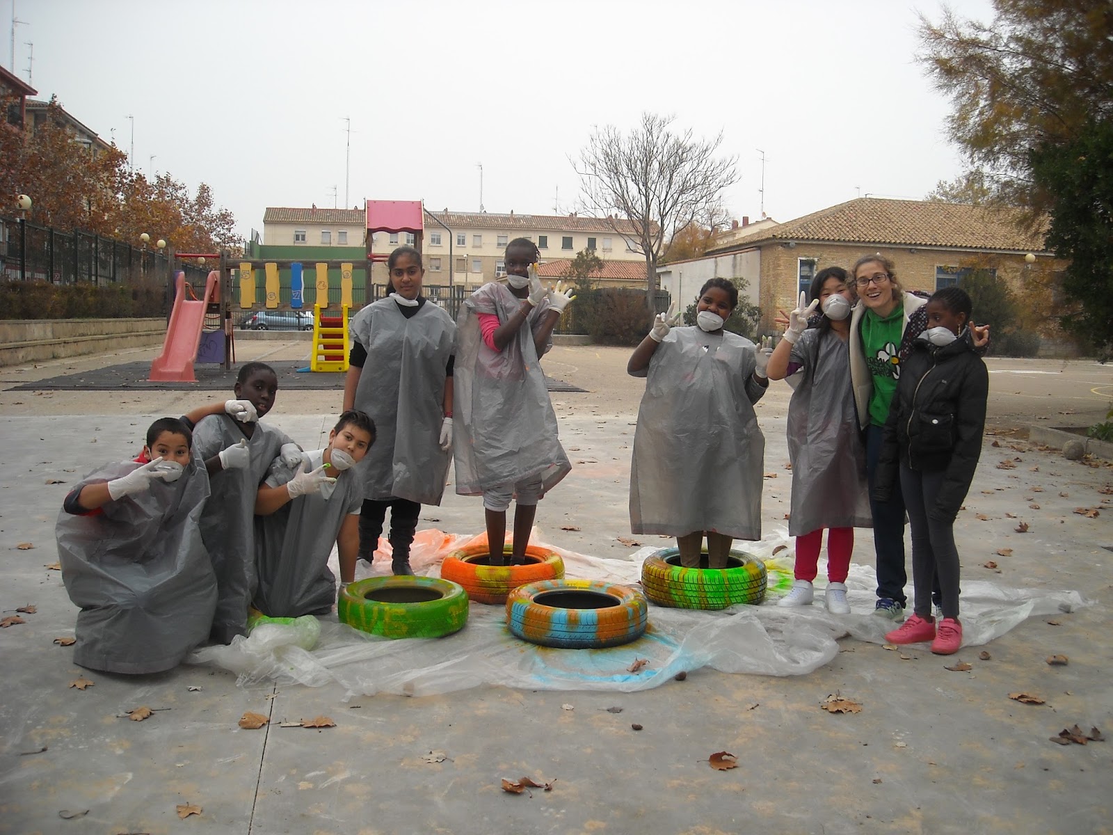 Hoy, con María, los niños y las niñas de 6º de Primaria hemos pintado unas ruedas con espráis de colores. Nos lo hemos pasado guay con una bolsa de basura, con guantes de médico y una mascarilla. ¡Parecíamos médicos! Estábamos: Mustafá, Bilal, Luis, Rebeca, Weifen, Aisha, Fule y Buru.